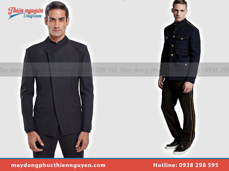 - Mẫu đồng phục: Đồng phục áo vest đen/navy dáng ôm, áo sơ mi trắng cổ điển kết hợp với quần âu đen hoặc chân váy bút chì màu đen. Phụ kiện điểm nhấn có thể là cà vạt màu đỏ đô cho nam, khăn quàng cổ màu xanh navy cho nữ, kết hợp với giày cao gót/ giày da màu đen.