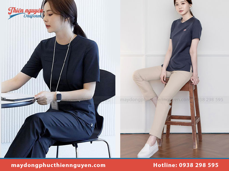 Đây là mẫu đồng phục mang lại sự trẻ trung, năng động, thường được sử dụng trong các bệnh viện, phòng khám hiện đại. Áo thun trắng kết hợp với quần xanh dương tạo sự thoải mái, dễ chịu cho người mặc.