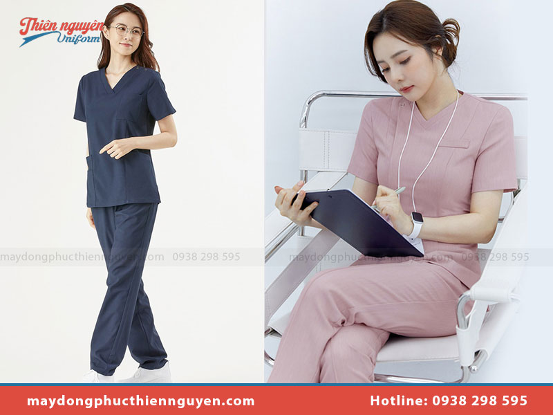 Đồng phục scrubs bao gồm áo và quần rộng rãi, thoải mái, thường được làm từ chất liệu cotton hoặc polyester. Loại đồng phục này phổ biến trong các phòng mổ, phòng cấp cứu và các khoa điều trị tích cực. Scrubs có nhiều màu sắc khác nhau, giúp phân biệt các bộ phận hoặc chức vụ trong bệnh viện.