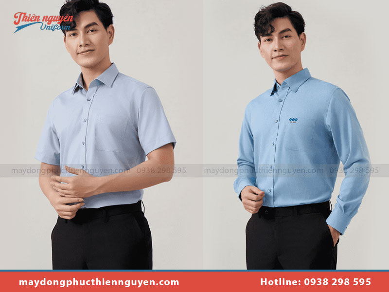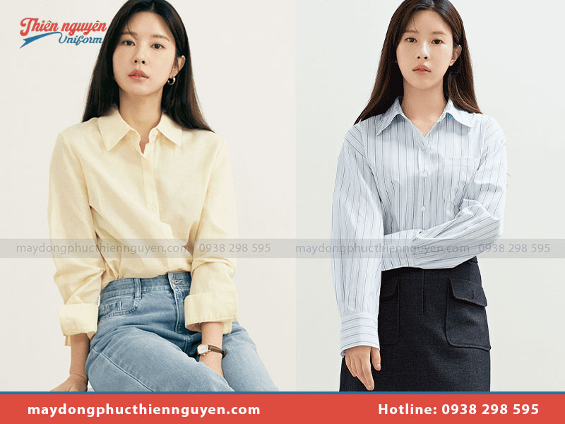 Áo sơ mi trắng hoặc màu pastel nhẹ nhàng là lựa chọn an toàn và dễ phối đồ. Bạn có thể thêm logo công ty để tạo điểm nhấn.