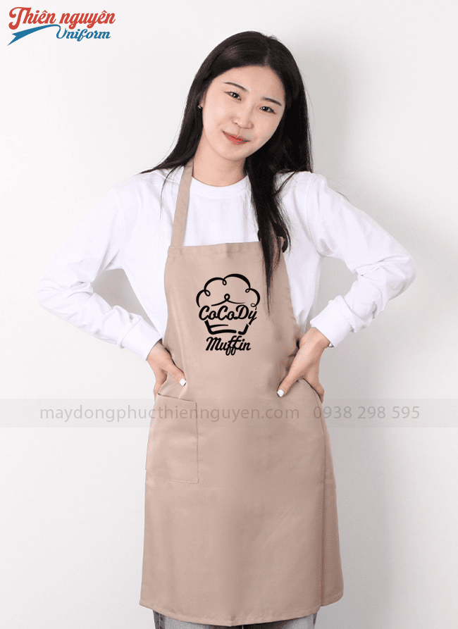 - In logo/họa tiết: In logo, slogan hoặc họa tiết độc đáo lên tạp dề theo yêu cầu của khách hàng.